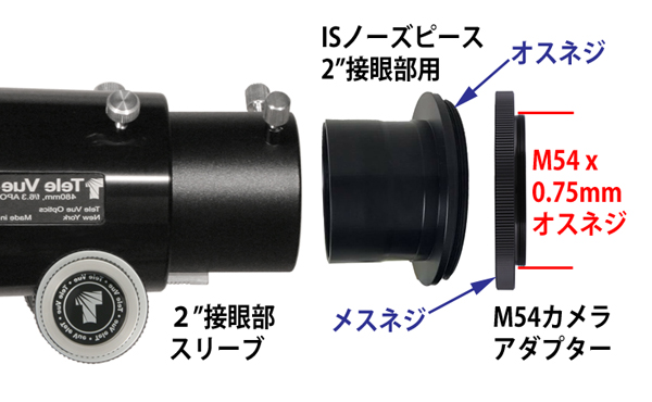 TV-76/85鏡筒の2"接眼部に、M54 x 0.75mmメスのCMOSカメラに接続するためのアダプター群。鏡筒の2"接眼部スリーブに、ISノーズピース、2"接眼部用を差し込み、同ノーズピース反対側のオスネジに、M54カメラアダプターのメスネジをネジ込むことで、鏡筒システム先端にM54 x 0.75mmのオスネジを設けることができ、M54 x 0.75mmメスネジが切られたCMOSカメラを接続可能にします。 |