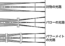 凹レンズ(バーロー)では,光路がアイピース近くで大きく振れます.この現象を利用して広角レンズの周辺像を改善したのがスマイスレンズで,メインレンズ系と一体で設計されます.単体レンズに対してこの光路は,歪曲を主体として,周辺像の悪化をもたらす原因になってしまいます.パワーメイトでは,あたかも単体の対物レンズのような光路で,周辺への影響を与えません.