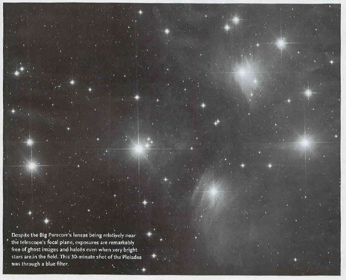 ME IIにライトブリッジを搭載したが、その不釣合いさは否めない。実際、ライトブリッジの本体にライトシュラウドを巻き付け、鏡筒内側に位置するパラコアのフロントレンズに迷光が届かないよう筒先フードも取りつけた。セットアップした撮影機材は、身長193cmの私を超えている。 ビッグパラコアのレンズは比較的望遠鏡の焦点面に近いが、写野に極めて明るい星があっても、驚くほどゴーストやハロがなく露出できる。このプレアデスは、ブルーフィルターを介し、30分の露光をかけた。