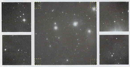 KAF-16803 CCDで、プレアデスの1分露光無較正画像の四隅からカットし、左右に振り分けたフル解像度画像からは、チップ四隅のケラレによる減光だけでなく、星像の質が判る。KAF-16803がカバーする対角線上のイメージサークルは52mmである。