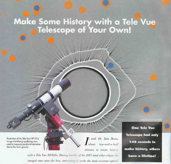 ドン・ブランズ博士はTele Vue-NP101isを活用し、たった2分半で歴史を残す。2017に全米を横断した皆既日食のもと、アインシュタインの予測「1.75秒を、太陽単位で出した太陽からの距離で割ることで求める値“1.75秒”」を、最高の光学精度で測定しようとする。「私の実験閣下は極めて良好、“1.7512秒”と、理論値に少数位を加えた精度で算出できた。撮影した皆既日食の画像を慎重に解析した結果、偏向定数を最終的に“1.7512秒”まで追い込んだ。パーフェクトな皆既日食にふさわしいパーフェクトな実験結果だ!」 歴史的科学実験から、家族で分かち合う想いでまで、テレビュー社のAPO鏡筒が十分な性能を発揮できる証です。あなたの家宝にふさわしい鏡筒をテレビュー社から。
