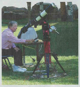ビッグイベント当日: 皆既日食の朝、準備を進める著者(左)。三脚は、スティーブ・ラングが皆既日食を記念に、太陽、内部コロナ、恒星をモザイクにしたコンクリート板にボルトで固定。右は、皆既日食を観ようとライオンズキャンプに集まったグループ。 この実験のために、メーカー各社が、Tele Vue社製 NP-101isアポクロマート屈折望遠鏡、Finger Lakes社製ML-8051 CCDカメラ、Bisque社製MyT Paramount赤道儀を貸してくれた。皆既日食の一週間前、従妹のスティーブ・ラングに手伝ってもらい、高度が高いこと、晴天が見込めることを求め、キャスパー近くのライオンズキャンプに機材をセットアップ。皆既日食当日、ライオンズキャンプは、英国からラトビア、ニューヨークからテキサスと、世界中からビジターを迎える。皆既日食をみんなで心置きなく楽しみ、日食後もいっしょに祝った。