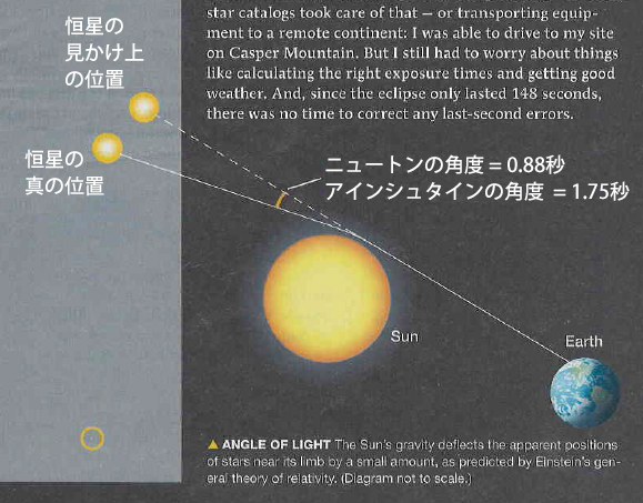 ▲光の角度 − アインシュタインの一般相対性理論の予測どおり、太陽の重力により、太陽の端に位置する恒星の見かけ上の位置はわずれる。