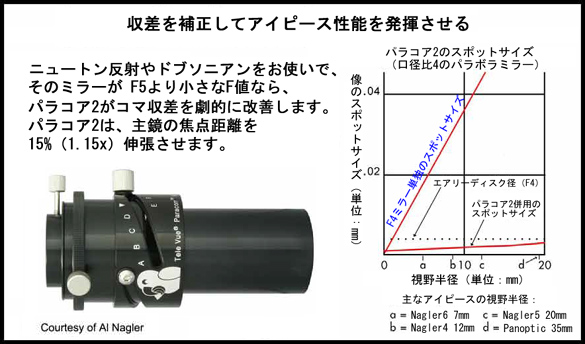 収差 アイピースの収差は、製造工程ではなく、アイピースの光学設計に依存します。アイピースで球面収差が見られることはほとんどありません。これは、アイピースの視野中心なら、シャープネスの違いがほとんどないことを意味します。 下の図は、多くのアイピースを、よく収差補正されたフラットフィールドF5.5屈折望遠鏡に装着して行ったテスト結果です。20°軸を外れた結果だけをみると、その違いは劇的です。これは違いを明らかにするあめの非常にセンシティブなテストです。通常の見え方を拡大したとしても、軸上であれば20°の領域でこのような違いをみることはできません。ただし、広い視野で軸を外れた領域では、とりわけF値の小さな望遠鏡に、良好に収差補正されたアイピースを装着すれば、主に非点収差が原因となる像不良が判るでしょう。像面湾曲は、アイピースと望遠鏡の設計に依存し、アイピース/望遠鏡の組み合わせしだいで、助長されることもあれば、打ち消し合うこともあります。「アイピースと望遠鏡の両方の視野がフラットなら、望遠鏡のF値に関係なく、焦点面が一致すれば、視野全体でシャープな像を結ぶことができる」というのが私の考え方です。視野のグリッドパターンが「樽型」か「糸巻型」のどちらかであるため、像面歪曲 (歪曲収差) が像面湾曲と誤解されることもあります。この像面歪曲 (歪曲収差) はアイピース特有のもので、通常、広い見かけ視界のアイピースで顕在化します。シャープネスや、その他の収差とは関係なく、おそらく、望遠鏡を動かしながらアイピースを覗かなければ決して判らないでしょう。収差補正のレベルは、今日のコーティング技術とともに、「スペースウォーク」を体感するに十分なところまで到達していると思います。 ニュートニアン、ドブソニアンなど、パラボラミラーを使うことで生じるコマ収差ですが、通常、アイピースにより顕在化することはありません。アイピースがどれだけパーフェクトでも、F値の小さなドブソニアンの視野周辺で彗星を観測したい人はいないはずです。上の表は、コマを補正することで星像パターンの「スポットサイズ」をどれだけ小さくできるかを示しています。これにより、ベストアイピースのパーフェクトな特性に挑むことのできる、ほぼパーフェクトな広視野・大口径反射望遠鏡の完成です。図の表では、F4ミラーの視野中心からわずか1mm外れると星像が劇的に劣化し始めることが判ります。一方、コマ補正光学系「パラコア2」を併用した場合、視野中心のすばらしい星像を視野全体で保つことができます。