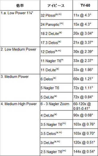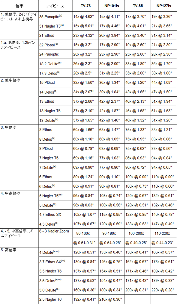 テレビューの屈折望遠鏡はいずれも焦点距離が短く、対象を広い視野で捉えることができます。なおかつ、コントラストが高く、シャープで、高倍率で色収差の無い”APO”設計により、極めて幅広い倍率で観ることができます。1.25、2インチダイアゴナルを介してテレビューアイピースを装着すれば、テレビュー屈折望遠鏡の性能を最大限に発揮できます。テレビュー鏡筒のようにF値の小さな望遠鏡の場合、装着するアイピースへの負担も増すことになりますが、テレビューアイピースはF値の小さな望遠鏡に用いても、広い視野全域で極めてシャープに像を結ぶ設計。イーソス、ナグラー、デロス、デライト、パンオプティックなどアイピースを装着することで、壮観な“スペースウォーク”を体感できます。メガネを装着しなければならないほどの乱視がある方は、乱視の数値を調べてお問い合わせいただければ、ユニークなソリューションをご紹介します。アイピースの選び方からアイピースの計算式について詳しく知りたいときは、アイピースの選び方 基礎編を参照ください。 とりわけ、見掛け視界100° のイーソス、82°のナグラー、72°のデロス、68°のパンオプティック、62°のデライトは、広くてシャープ像はもとより、対象が移動する視野が広いため、手動式経緯台でもより長く観続けることができます。対象を視野の”スイートスポット”にもっていくために望遠鏡を頻繁に動かす必要はありません。テレビューアイピースとテレビュー屈折望遠鏡の組合せなら、もちろん、“スペースウォーク”の全域が”スイートスポット”です。 広視野の低倍率から、惑星対象の高倍率まで、アイピースの数は3本から4本もあればこと足ります。以下、2インチダイアゴナルを付けたTV-76、TV-85、NP101is、NP127is屈折望遠鏡と、1.25インチダイアゴナルを付けたTV-60屈折望遠鏡に推奨できるアイピースを、それぞれ2つの表にしました。
