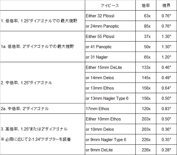 詳細はお電話等でお問い合わせいただくとして、口径25cm以上のシュミカセ鏡筒をお使いの場合、2"アイピースのメリットを活かすことで、すべてのニーズをわずか2本のアイピースで満たすことも可能です。 |
