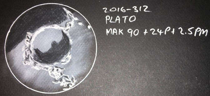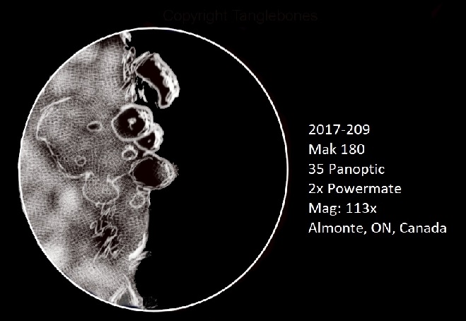 Copernicus Crater by AstroBin user Tanglebones. Copyright by the artist. Used by permission. Sky-Watcher Mak 180 Proに、テレビュー社製パンオプティック35mm + 2倍パワーメイトを装着。 最近、AstroBin.comというサイトで、パンオプティックとパワーメイトで描いた月のスケッチに驚きました。月面写真ならフラットに撮られる月の姿を三次元的に描かれています。テレビュー社はアカウントホルダー“Tanglebones”に連絡をとり、スケッチを使わせていただくよう頼みます。ここで紹介するスケッチは、同氏から承諾をいただいものです。 私はテレビュー製品を愛用しています。天文経験はまだ短いので、仲間内で評判の同社を選ぶことにし、最近、デロスシリーズから3本のアイピースを入手しました。まだあまり使い込でませんが、少し覗いただけでいずれも好きになりました。しかしながら、やはりパンオプティック35mmに代わるものはありません。SW Mak 180鏡筒で最大実視界をケラレなく得られる私のお気に入りです。望遠鏡が外気になじんだ時にパンオプティック35mmで観る眺めはすばらしい。この組み合わせで観るM42が好きで、いくつも折り重なる星雲から目が離せない。