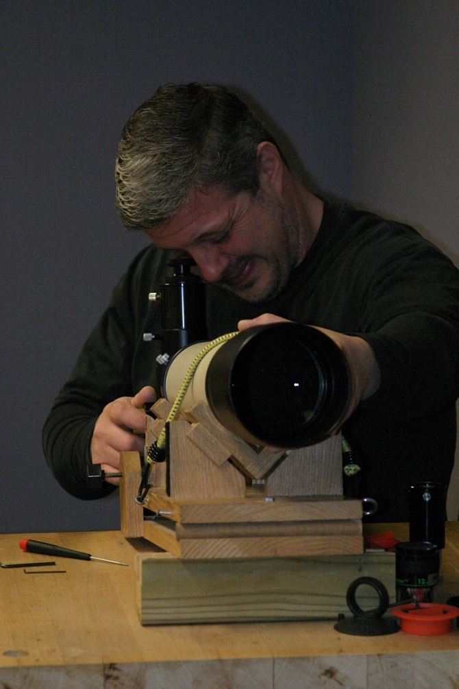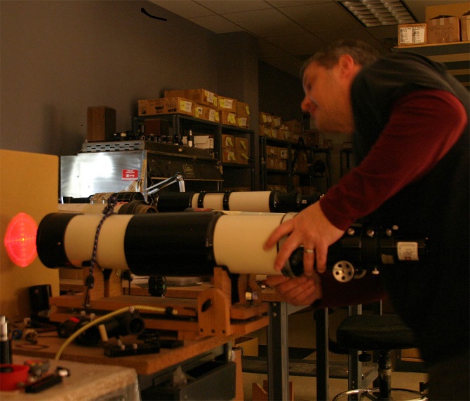 さいごに、コントラストをできるかぎり高く保つための作業工程に入ります。それぞれのレンズにはその硝材に適したマルチコートが施され、金属部品の内側には迷光を押さえるための様々な工夫が施されます。 そのため、それぞれの望遠鏡は初工程から最終工程まで「ひとり」の担当に任されます。テレビュー社の製造工程には組立ラインや作業分担がありません。光学系と機械部品は検査、適合、組立、調整、精査の工程を経、社力を尽くした望遠鏡が完成します。 テレビューの小口径ダブレットAPO屈折望遠鏡 Tele Vue-60、Tele Vue-76、Tele Vue-85では、できるだけコンパクトな形状でアポクロマート性能を発揮できる望遠鏡を目指しました。対物をダブレットで設計することで目標とするアポクロマート性能に到達できたうえ、重量バランスを崩し、組立・材料コストが増しても、ユーザーに提供できる光学メリットがほとんどないトリプレットは採用しませんでした。鏡筒の仕様が示すとおり、口径が小さくなるほど、対物のF値は小さくなっています。 3モデルとも極めて近い光学性能を発揮する一方、口径が小さくなるほど、焦点距離を短く設計することが可能です。 テレビュー大口径ナグラー・ペッツバール APO屈折望遠鏡 アル・ナグラーは、ベッツバールのポートレイトレンズコンセプトを採用。レンズ間隔の広いダブレットを用いペッツバール(Josef Petzval)式光学系を基に、アイピース検査を目的に設計した短焦点広角屈折望遠鏡「5” F4 MPT(Multi-Purpose Telescope)」で特許を取得したのは、30年以上も前のこと。その後20年間、“multi-purpose”コンセプトのパーフェクトな工学系に向けて改良を重ねた結果、2001年、Nagler-Petzval 101が誕生。Backyard Astronomer’s Guideでは、“この光学系にこれ以上改善の余地無し”との評価をいただきました。により、F5.4という短焦点設計を保つ一方、新ガラス素材を採用することで、鏡筒長をさらに短くするだけでなく、理想的な色収差補正レベルと、よりフラットな像面を実現しました。さらに、Tele Vue Imaging System (“is”) 鏡筒では、接眼部を2.5インチ仕様にし、オプションアクセサリを充実させることで、大フォーマットでピクセルの小さなCCDチップに対応する鏡筒を実現しました。 トリプレット設計では実現できない特性 NP101is、NP127isに組み込まれた4枚の対物レンズは、分離式ダブレットを2組み合わせた設計です。この設計を、対物の後郡が大きな拡大域に配され、前群で補正できない収差を補整しているため、「組込型フラットナーを持つダブレット対物」、と誤って解釈されることがあります。指定のガラスを配した構成は、F値のきわめて小さなF5.4、F5.2で理想的に収差補正するのに不可欠です。F値をあえて小さく設計したのは、眼視、撮影ともにできるかぎり広い実視界を実現しながらも、軸上および横方向の色収差、波長ごとの球面収差、非点収差、コマ、像面平坦性を理想的に補正するためです。レンズ構成をどのようにしたとしても、以上のすべてをトリプレット設計で満たすことはできません。 ナグラーペッツバール“is”鏡筒の組立 構造的に複雑な“is”鏡筒の場合、口径の小さなテレビュー鏡筒の製作工程の他に、is鏡筒固有の組立・検査工程が要求されます。撮影機材の重量を考慮し、接眼部には“たわみ”テストを実施。ドローチューブ先端に4.5kgを超えるウェイトを装着した状態で、ドローチューブの前後駆動範囲のほか、回転方向の4か所で、ドローチューブに偏りが無いことを1/1000インチ単位で測定検査します。次に、メカニカルアッセンブリのアライメントをレーザーで調整します。光学系を組み込み、コリメーションを終えた後、テレビュー社独自のコリメーティングリングに据えると、視野/写野の周辺性能を確認しながら、ティルト調整機構を備えたエンドリングが像面と並行になるように調整します。