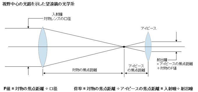 一般的に知られた仕様の意味を理解すると、望遠鏡のコンセプトが判りやすくなります。一方、誤解を招く仕様であったり、専門用語でない場合、紛らわしいことも少なくありません。 カメラ カメラには、主として、焦点距離とF値という仕様があります。 1.焦点距離 焦点距離はフィルム上の画像サイズを決めます。ズームレンズなら、35mmのときは“広角”、50mmで”標準”、135mmで”望遠”です。フィルムサイズが35mmなど一定の場合、焦点距離により”視野”が決まりますが、この仕様は無視されたり、直接的に示されることがありません。”視野”とは実際に見られる画角であることは当たりまえですが、焦点距離に反比例します。ズームレンズを135mmにしたときに倍率は最も高く、視野は最も狭くなり、35mmなら、倍率が最も低く、視野は最も広くなります。実際、視野サイズの約4倍 (135/35)、視野領域の16倍です! 多くの人は当然のようにF値と焦点距離を混同し、F値を変えると魔法のように画像サイズも変わると思い込んでいます。画像サイズと視野サイズに影響するのは焦点距離のみです。 2.口径比、すなわちF値 たとえば、レンズバレルに1:2と書かれていればF2のことで、フィルムに到達する光円錐の”太さ”を示します。光円錐が”太ければ太いほど”、光が多く、露出も短くなります。F値は、実際、レンズの有効径に対する焦点距離の比です。焦点距離50mm F2レンズの有効径は25mmです (レンズ径はインチ、焦点距離はミリで表すことがある_1インチ=25.4mm)。ほとんどの人はF2のレンズはF4よりも明るい (小さい) ことはすぐわかりますが、明るさが2倍ではなく4倍であることに気づきません!また、F2レンズの方がシャープだという誤解もあります (理屈上は可能でsも、現実的には希なケース)。 F値はカメラにとって重要な値ですが、フィルム感度と被写体の明るさは露出変数なので、望遠鏡で観たときの像の明るさには直接関係しないことがわかります。“望遠鏡ファン”になりたての写真ファンにとっては、衝撃的なことかもしれませんね。 一方、仕様の中でF値についてまったく触れない、とてもありがたい双眼鏡の業界があります。
