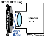 一方、カメラレンズとアイピースの組合せを一つのリレー系として考えて、有効焦点距離を求める方法もある。上の例の場合、50mmのカメラレンズと10mmのアイピースを使用し、リレー比を5xとし、5 掛ける 望遠鏡の焦点距離600mmで、有効焦点距離が3,000mmとなる。 ・カメラレンズのネジ(左端)またはフィルターネジ(左端近辺)に、テレビューのデジタルアダプターリング(28mm、37mm、49mm)を装着し、そのまま、またはステップリングを介して、望遠鏡接眼部に装着したアイピースに取り付ける。 |