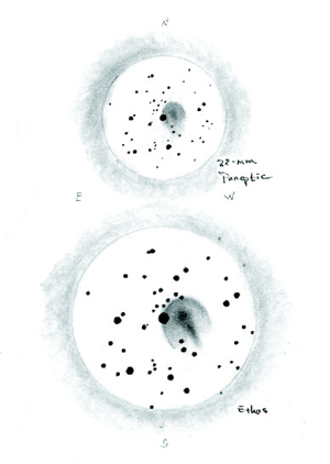 天の窓 さそり座の球状星団M4(5.6等)からはじめる。M4を導入するため、NP-127で30倍、実視界2.2度を実現するパンオプティック22mmを使う。 パンオプティック22mmでみるM4は、やわらかく丸く広がっている。あかるいが、ぼんやりとした星団の「傷あと」が北から南に走る。視野東端にはオレンジ色のアンターレスが鎮座、北西の等距離にはシグマScorpiiが輝く。 すべての対象が乳白色の星の光を背景に輝き、ところどころ淡い星雲の筋がこするようにみえている。まるで芸術家の筆からかもし出されたかのようである。 アイピースをイーソスに取り替えてみると、にわかにとまどう。視野全域はまったく同じ1.9度なのだが、M4をおよそ倍の倍率でみていることになる。同じ球状星団がこんどは、くっきりとした暗いレーンで囲まれたあざやかな恒星からなる月の大きさになる。中央のあわい「傷あと」は、球状に輝くあわい恒星を背景に、シャープに結像した10〜12等の恒星になってみえてくる。 パンオプティック22mmでは容易に認識できなかった外側を取り巻く光輪の姿も、球状星団M4の中心まわりに、一連の星の光が長く平行に密生し、太い放物線が形成されているのが判る。暗い背景により、M4だけでなくNGC6144の明るさも助長され、星の光で照らされる不規則な終端と、わずかに凝縮されたコアのあるはっきりとした球状星団に変わる。 広視界で拡大された対象の「WOW」係数は、「あわく不明瞭な対象」を観測したいアマチュアならだれもが高く評価する。さらに、イーソスは、とりわけ幅が10′を下回るディープスカイ対象を見つけ出して確認するときも時間の節約になる。 たとえば、白鳥座にある幅27″のまばたき星雲(NGC6826)など。22mmのアイピース(30倍)なら、実際、星の光にしかみえないが、イーソスを装着し倍率を上げることにより、小さく広がるディスクのような星雲であることが判ってくる。 従来のアイピースなら視野外にある対象も、イーソスなら有効視野内に飛び込んできて、比較対照できるメリットを感じる観測者も数多く出てくるだろう。また、コメットハンターにしても、より広い領域を高い倍率でカバーできるため、淡い彗星をとらえるチャンスが高くなる。